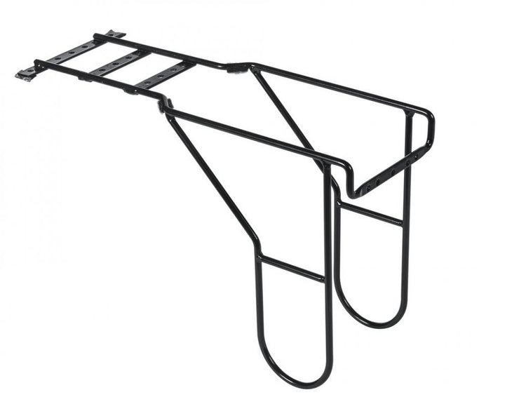 Der Basil Carrier Extender ist eine robuste Gepäckträger-Verlängerung aus pulverbeschichtetem Stahl in mattem Schwarz. Sie erweitert nahezu jeden standardmäßigen Fahrrad‑Gepäckträger auf eine Länge von ca. 41 cm und bietet somit deutlich mehr Platz für Doppeltaschen, Einkaufstaschen oder zur Nutzung in Kombination mit einem Kindersitz. Seitliche Stützstreben verhindern zuverlässig, dass Taschen in die Speichen gelangen. Zusätzlich verfügt die Verlängerung über eine Bohrung zur Montage eines Rücklichts mit einem Lochabstand von 50–80 mm.