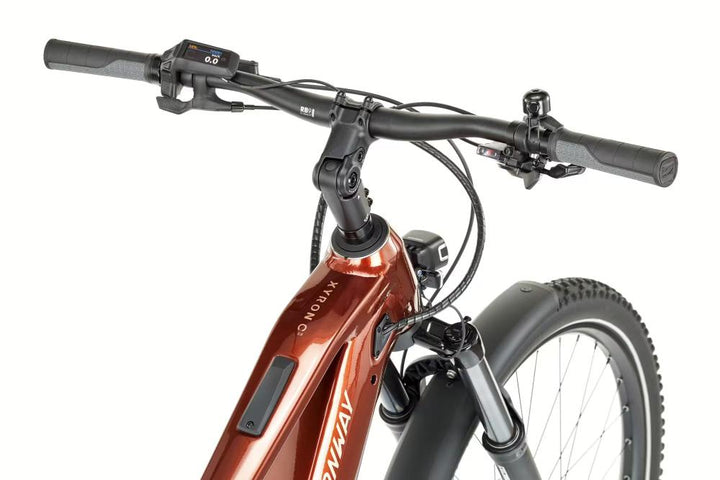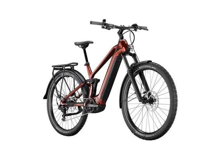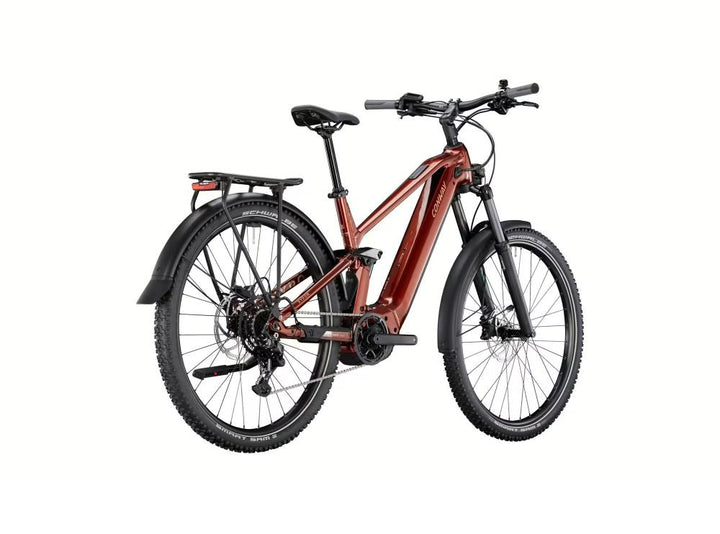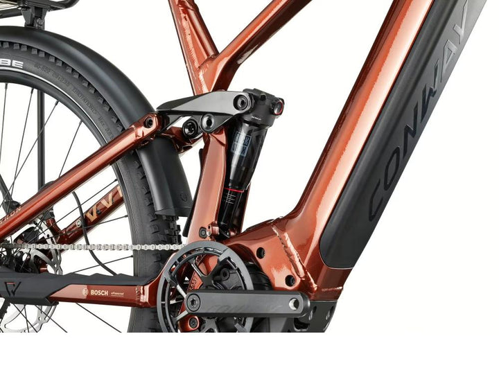 E-Mountainbike CONWAY Xyron C 2.0 750 Full Suspension 29" rustred 9-Gang – Rahmengröße 43 cm, vormontierte Bereifung und Komponenten, BOSCH PowerTube Akku 750 Wh, BOSCH Performance Line CX Mittelmotor, Lichtanlage vorne und hinten, Schutzbleche, Gepäckträger, Ständer, serienmäßige Pedale und alle serienmäßigen Anbauteile laut Herstellerangaben.