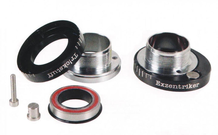 Das Trickstuff Exzentertretlager für Standardrahmen ist das erste und weltweit einzige seiner Art. Es kann in ganz normale BSA-Tretlagergehäuse montiert werden und nimmt jede herkömmliche 24-Millimeter-Tretlagerwelle auf, wie z. B. die Shimano Hollowtech II und viele andere.Dieses Tretlager dient zur stufenlosen Einstellung der Kettenspannung bei Singlespeedern oder Nabenschaltungsbikes, wie z. B. der Rohloff. Dadurch werden Kettenspanner oder Ausfallenden überflüssig.