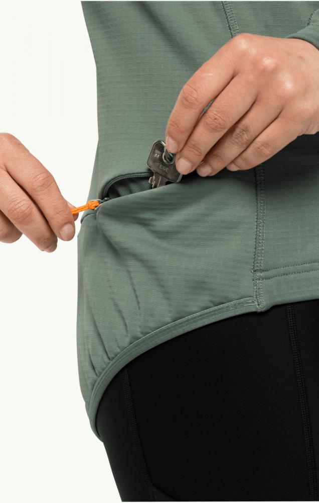 Die Jack Wolfskin Morobbia FZ Light W Fleece Jacke ist eine leichte Fleecejacke, die als Solojacke oder Midlayer in einem Schichtensystem getragen werden kann. Das elastische, atmungsaktive Stretchfleece bietet viel Bewegungsfreiheit und die Waffelstruktur im Inneren fördert die Belüftung und erleichtert das Packen der Jacke. Der Einsatz aus TEXADRI COOLING-Mesh am Rücken sorgt für eine optimale Balance zwischen Wärmerückhalt und Temperaturregulierung und kühlt, wenn du mit einem Rucksack unterwegs bist. Der Reißverschluss geht bis zum Kragen hoch und in der kleinen Reißverschlusstasche kannst du deinen Schlüssel sicher verstauen.