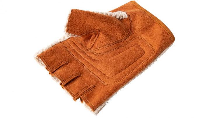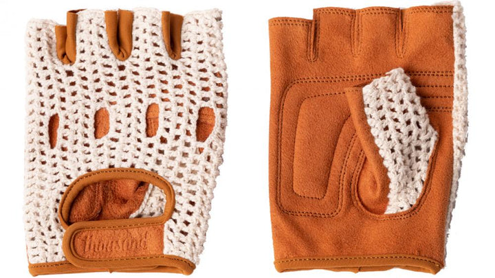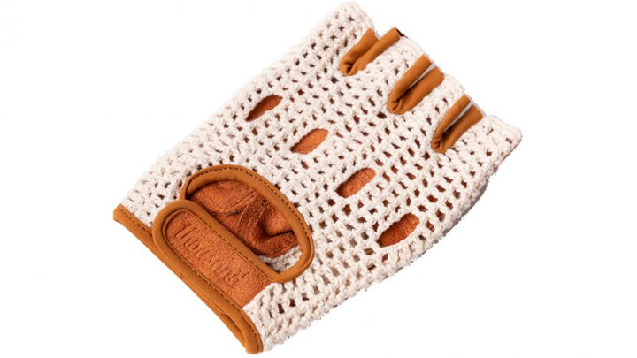 Thousand Little 5 Fahrradhandschuhe Crème, Kurzfinger, Größe S, Vintage-Retro-Design, gehäkelte Baumwolle, veganes Amara-Wildleder, gepolstert, atmungsaktiv